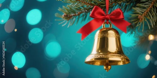 Golden Christmas bell with red bow hanging on pine branch. Merry Christmas and Happy New Year background with copy space