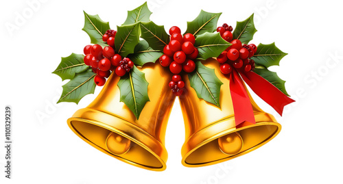 Golden Christmas Bell with Red Ribbon and Holly on Transparent Background