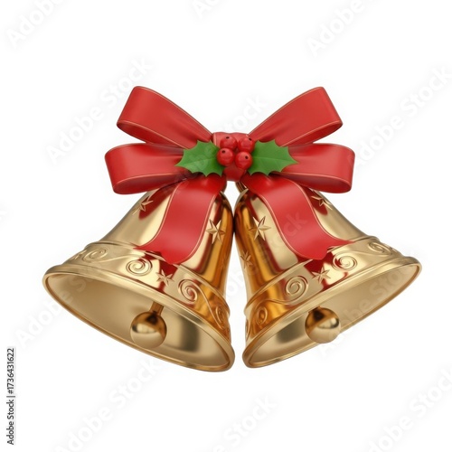Golden christmas bells decorated with red ribbon and green holly festive holiday decoration isolated on white background