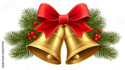 red bow, gold, jingle-bell, festive, celebration, winter, season, new year, ornament, traditional, merry, evergreen, pine, berry, gold, seasonal, symbol, element, design, elegant, classic, tradition, joy, happiness, bright, illustration, icon, isolated, white background, greeting, card, invitation, banner, template, decor, event, party, background, graphic, vector, art, object, glossy, realistic, glowing, chime