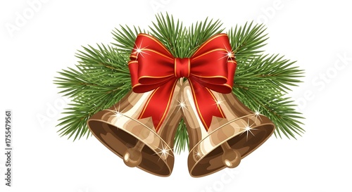 christmas, bell, gold, red ribbon, bow, pine needle, evergreen, holiday, decoration, ornament, seasonal, festive, winter, celebration, greeting, traditional, shiny, metallic, glistering, sparkle, isolated, white background, clip art, illustration, design element, new year, joy, season, merry, happy, song, sound, jingle, twinkling, ornate, elegant, classic, vintage, holly, chaplet, garland