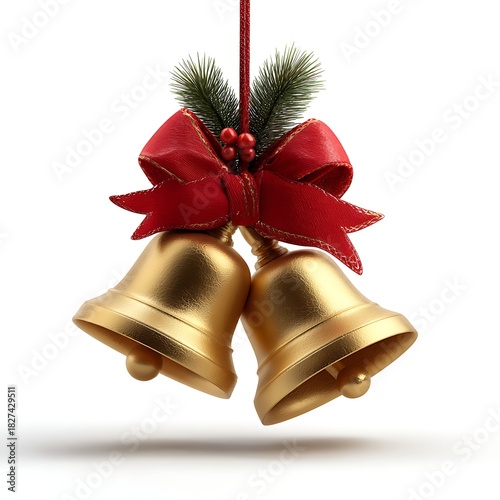 Golden christmas bells with red bow isolated on white background festive 3d props and accessories for holiday decor