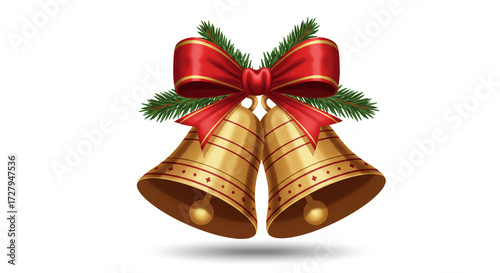 Golden christmas bells with red bow isolated on white background illustration