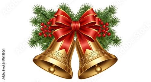 christmas, bell, gold, red, ribbon, bow, pine, tree branch, holly, berry, decoration, ornament, holiday, season, winter, greeting, card, celebration, party, event, festive, joy, happy, new, year, christmas, traditional, vintage, antique, sound, music, jingle, ring, shiny, bright, sparkle, glistering, luxury, elegant, classic, design, element, graphic, cut-out