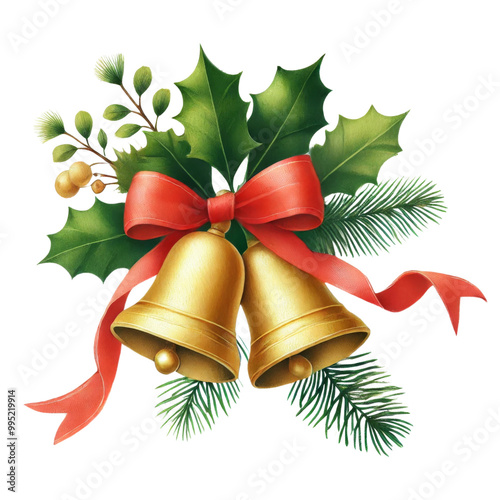 christmas, bell, gold, red, ribbon, holly, berry, leaf, holiday, decoration, watercolor, festive, winter, celebration, evergreen, green, pine, traditional, ornament, nature, illustration, design, greeting card, invitation, new year, art, seasonal, chaplet, botanical, spruce, pine needle, decorative, december, holiday season, christmas, rustic, bow, gift, elegant, vintage, classic, cone, tree branch, brown