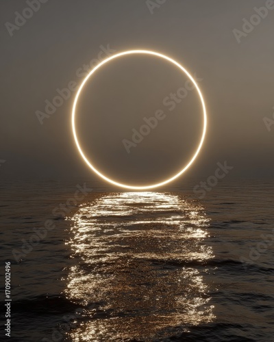 glowing, circle, sunset, ocean, water, light, gold, ring, illumination, horizon, sea, wave, calm, peaceful, mystical, abstract, art, digital, graphic, design, modern, contemporary, illuminated, over, of, surface, artistic, minimalist, geometric, fantasy, dreamy, spiritual, hopeful, positive, serene, tranquil, sunlit, on, painting, illustration