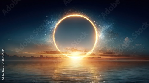 sunset, circle, ring, light, glow, horizon, water, sky, cloud, gold, orange, blue, dark, night, empty, frame, stage, creative, digital, graphic, photo, manipulation, design, modern, art, abstract, space, placeholder