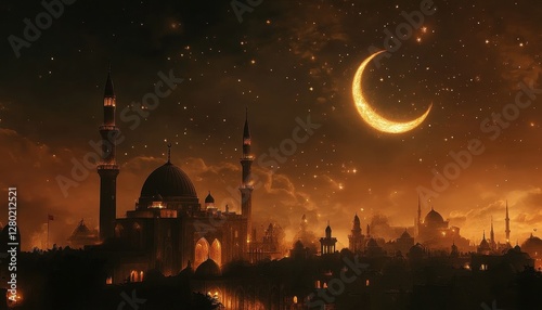 eid, holy, arabic, ramadan, muslim, islamic, night, sky, crescent, moon, star, mosque, city landscape, gold, orange, warm, dark, architecture, religion, festival, celebration, spiritual, faith, hope, peace, calmness, serene, magical, mystical, evening, illuminated, building, tower, light, glow, hours, dusk, starry, moonlit, city, landscape, urban, religious, culture, tradition, belief