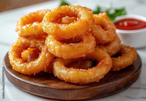 Golden Crispy Onion Rings Stacked on Wooden Plate with Fresh Green Garnish and Red Ketchup Sauce on Elegant Background
