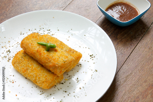 Golden Crispy Risoles with Red Chilis Sauce Close Up View Indonesian Snack Asian Cuisine