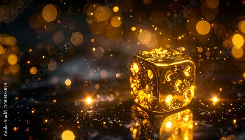 Golden dice with water drops reflecting light, bokeh background. Perfect for luck, chance, gamble concepts.