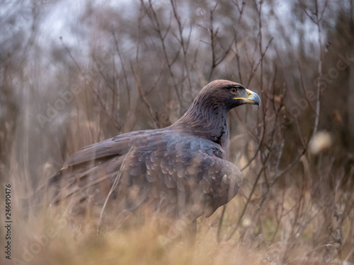 Golden eagle (Aquila chrysaetos) on the ground. Golden eagle portrait. Golden eagle sitting on ground.