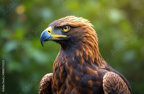 Golden eagle bird of prey looks intently. Majestic raptor with intense eyes and sharp beak poses against blurred green nature background. Wildlife predator stands.