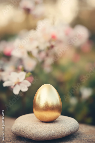 Golden egg placed on a stone with blooming flowers in a garden setting