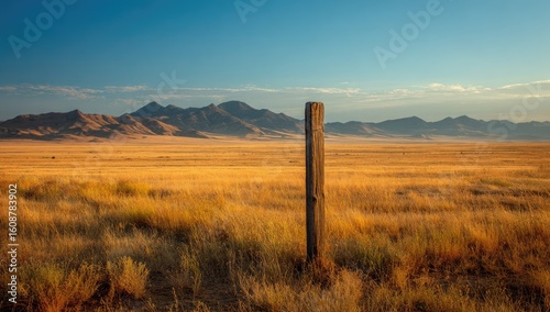 landscape, field, grass, post, mountain, gold, sunlit, dry, empty, horizon, nature, still, rural, arid, western, plain, desert, autumn, morning, afternoon, light, colours, texture, brown, yellow, wood, fence, peak, range, distant, wide, open, huge, scenic, quiet, peaceful, beauty, image, photo, view, sky, blue, golden hour