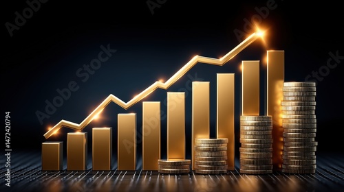 Golden financial growth chart with bars, coins, and upward arrow