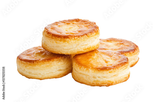 Golden flaky biscuits stacked on white background, cut out