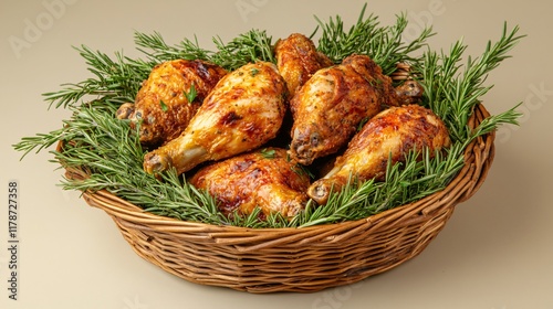 Golden fried chicken in a wicker basket with fresh herbs, isolated on a warm beige surface