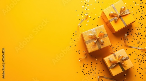 Golden gift boxes with sparkling ribbons on yellow background