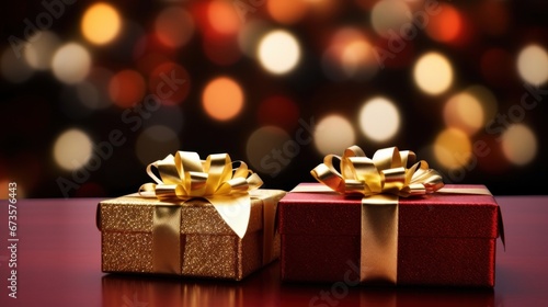 Golden gift presents on a light dark red background with colorful bokeh and stars glittering