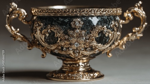 Golden Goblet: A captivating close-up showcases an opulent golden goblet, adorned with intricate floral and scroll designs. The elegant craftsmanship reflects a sense of luxury and timeless beauty.