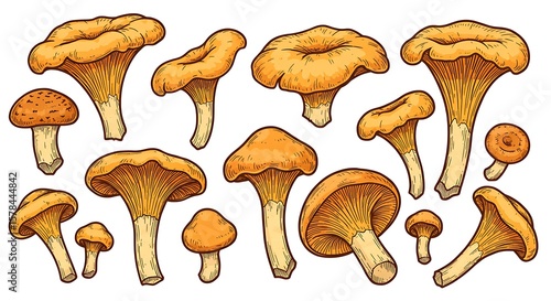 mushroom, fungal, chanterelle, yellow, orange, gold, food, illustration, drawing, nature, harvest, collection, variety, shape, size, edible, fungal, mycology, botany