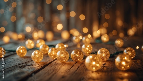 Golden holiday lights on a rustic wooden surface for a backdrop.