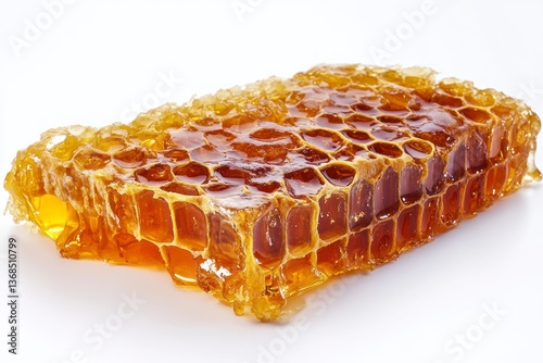 Golden Honeycomb Piece Filled with Honey on White Background Close Up