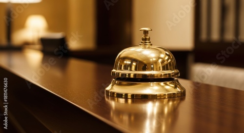 Golden Hotel Service Bell on Wooden Reception Desk in Elegant Lobby
