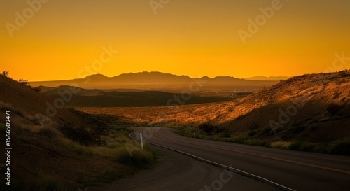 Golden Hour Desert Highway Scenic Road Trip Through Arid Landscape at Sunset