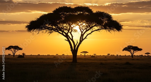 sunset, sunrise, savanna, acacia, tree, silhouette, gold, orange, yellow, sky, cloud, sun, nature, landscape, scenery, horizon, africa, wildlife, wilderness, tranquil, serene, peaceful, majestic, beauty, illuminated, shadow, evening, morning, light, heat, warmth, huge, plain