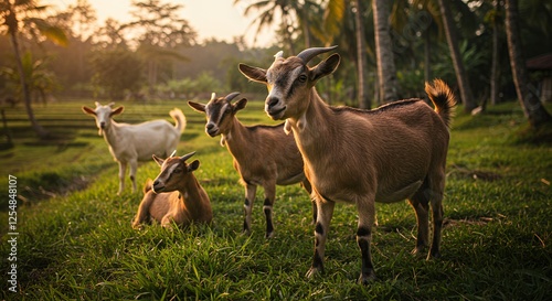 goat, farm, animal, grass, rural, landscape, nature, sunset, gold, hours, tropical, paradise, field, pasture, farm animal, mammal, agriculture, countryside, wildlife, fauna, children, herbivore, domestic, brown, white, green, sunlight, peaceful, serene, calm, evening, daytime, outdoors, photo, image