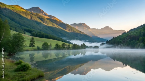 mountain, lake, fog, mist, sunrise, landscape, nature, scenic, beauty, water, tree, forest, sky, cloud, morning, outdoors, wilderness, alpine, vale, dawn, light, green, blue, calm, serene, peaceful, tranquil, atmosphere, natural, vista, view, gold, hours