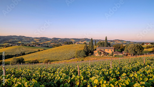 rolling hills, vinery, golden hour, countryside, landscape, agriculture, rural, sunset, scenic view, nature, wine country, field, idylli, picturesque, twilight, farmland, peaceful, tranquil, grapevine, sunlight, blue skies, shadow, horizon, ecotourism, natural beauty, travel destination, pastoral, serene, heritage, winery, summer evening, golden light