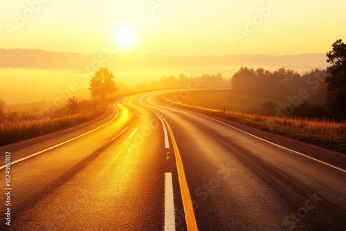 road, highway, sunrise, sunset, asphalt, countryside, landscape, horizon, travel, journey, adventure, exploration, freedom, open, path, way, route, direction, destination, drive, summer, morning, gold, yellow, orange, warm, light, sun, ray, dawn, nature, scenery, rural, tree, field, fog, mist, atmosphere, scenic, vista, panorama