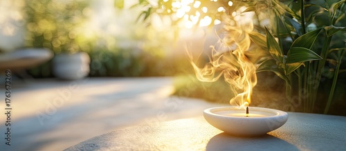 candle, flames, smoke, wax, wick, light, sunlight, burning, glowing, serene, calmness, peace, calm, mindfulness, wellness, spa, aromatherapy, relaxation, meditation, zen, garden, nature, plant, bamboo, green, gold, warm, yellow, sunset, sunrise, backlighting, bokeh, blur, soft, sharpened, shallow, depth, field, atmospheric, ambient, harmony, spiritual, contemplative, beautiful, elegant, still, life, background
