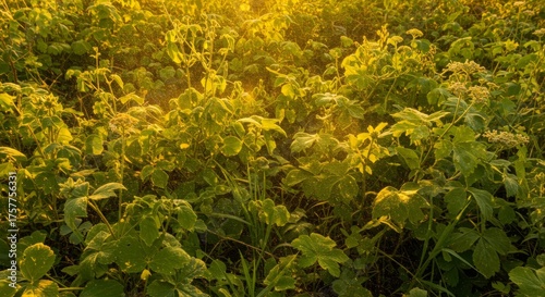 plant, field, green, yellow, nature, leaf, gold, hours, sunrise, sunset, sunlight, foliage, agriculture, rural, landscape, scenery, vegetation, flora, botanical, growth, dew, morning, evening, light, ray, bright, vibrant, lush, texture, background, pattern, detail, closeup, photo, image, photo, picture, still, view, scene, environment, ecology, countryside