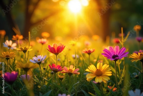 Golden hour sunlight streams through leaves onto a vibrant flower meadow, radiating joy and serenity A scene of pure, unadulterated bliss and peaceful happiness , wellbeing, orange