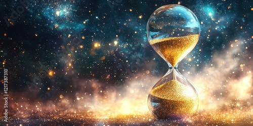hourglass, sand, gold, glistering, cosmic, background, star, space, universe, galaxy, time, eternity, flow, measure, passage, moment, duration, second, minute, hours, day, year, century, infinite, immensity, mystery, wonder, magical, sparkle, shimmer, light, dark, nebula, celestial, dust, gold, glasses