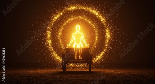 Golden Humanoid Silhouette Sitting in a Wagon Amidst Swirling Particle Vortex