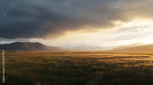 Golden landscape at sunset, expansive fields under dramatic clouds, perfect for nature themes and text overlays.