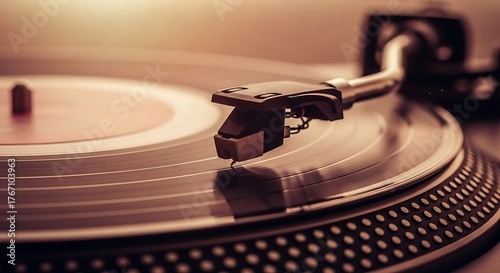 Golden Light on a Vintage Turntable Needle Tracing Grooves of a Spinning Vinyl LP.