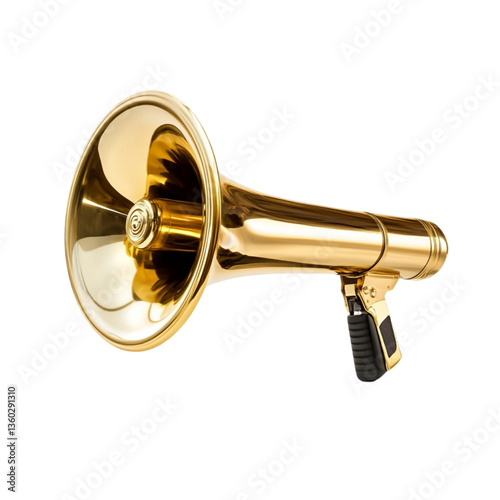 megaphone, loudspeaker, announcement, communication, brass, gold, yellow, black, red, white, line, stripes, pattern, texture, powerful, voice, sound, message, attention, advertisement, marketing, promotion, broadcasting, protest, rally, event, weapon, gun, handle, abstract background, modern art, graphic design, colourful, vibrant