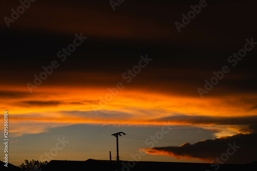 Golden moody clouds by the rays of the dawn sun after sun has just set behind.