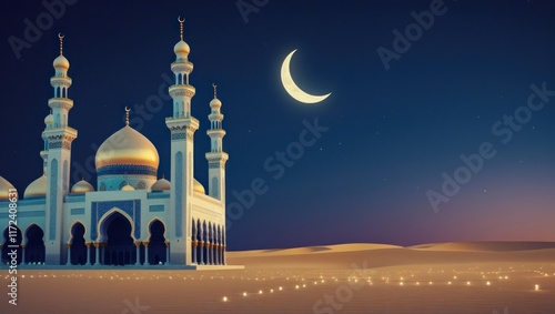 Golden Mosque and crescent moon background for Ramadan Kareem.