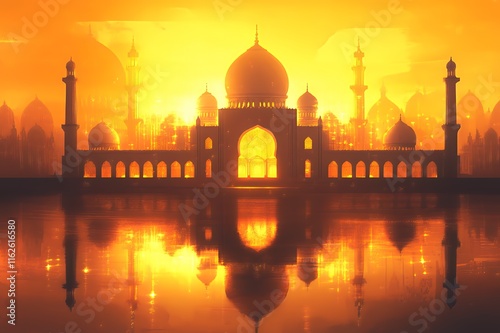 mosque, gold, sunset, water, calm, architecture, islamic, dome, minaret, city, building, orange, yellow, light, beautiful, serene, peaceful, tranquil, spiritual, faith, religion, islam, arab, culture, tradition, majestic, grand, impressive, elegant, ornate, detail, silhouette, shadow, evening, dusk, sky, horizon, scene, artwork, art, painting, illustration