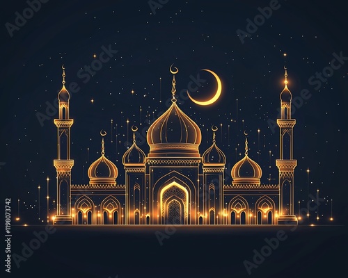 mosque, islam, muslim, ramadan, eid, celebration, religion, faith, spirituality, prayer, night, gold, gold, crescent, moon, star, architecture, building, dome, minaret, light, glow, sparkle, design, illustration, background, pattern, texture, abstract, art, graphic, vector, holiday, festival, ornate, elegant, luxury, sacred, peace, tradition, culture, heritage, symbol, belief