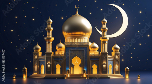 Golden mosque with tall minaret and glowing crescent moon in dark blue sky perfect for beautiful Eid Mubarak greeting Islamic Card Design