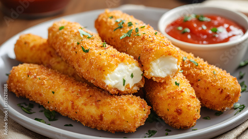 Golden mozzarella sticks with a crunchy texture, served with a creamy, spicy dip for a delightful snack experience.