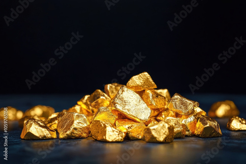 Golden nuggets shining brightly against dark background, showcasing their rich texture and color. This captures allure of precious metals and wealth